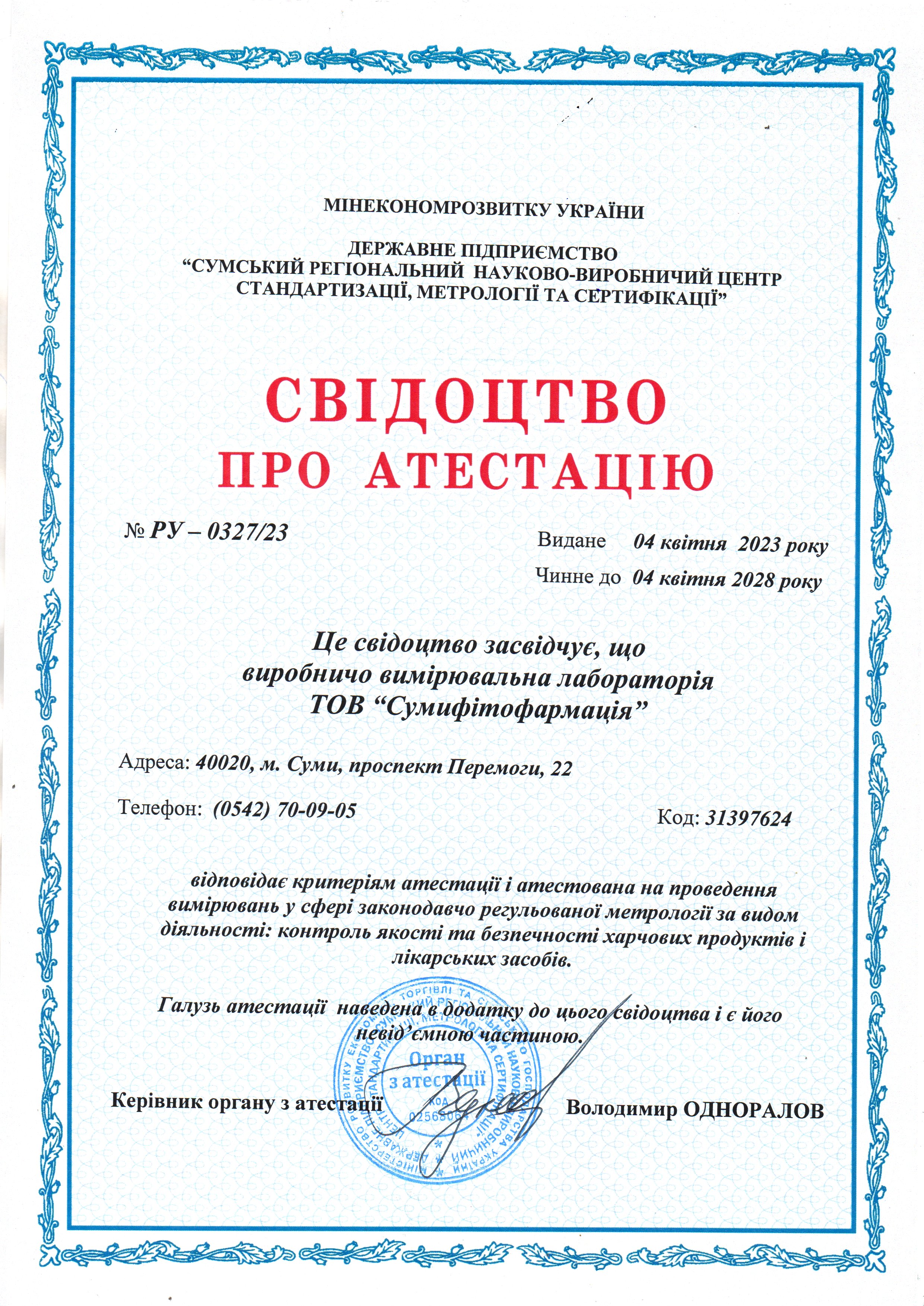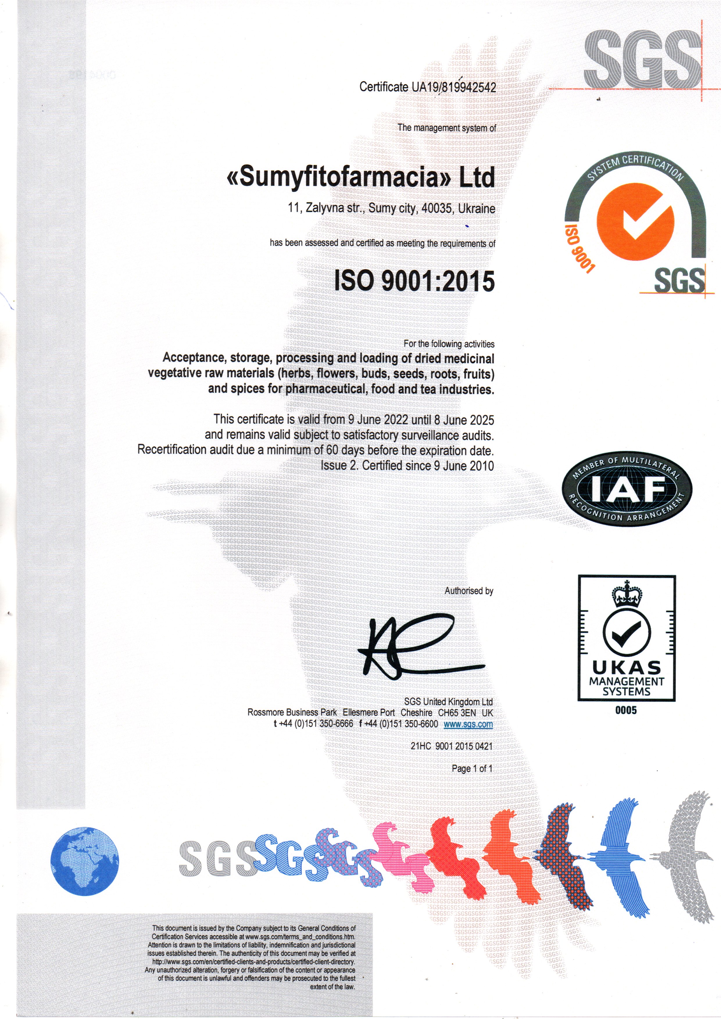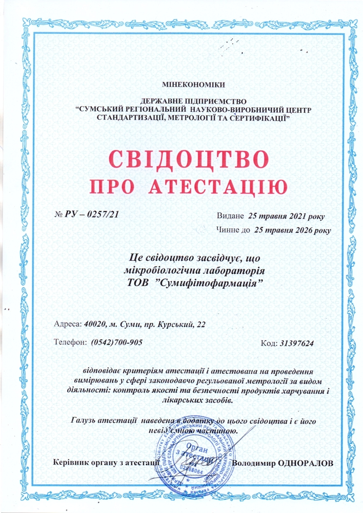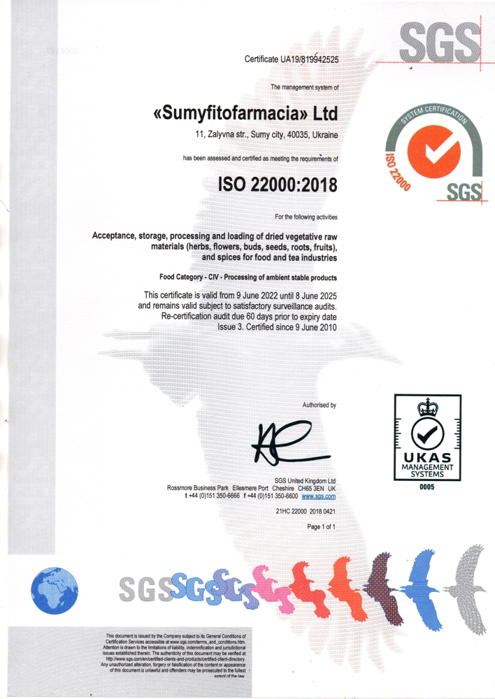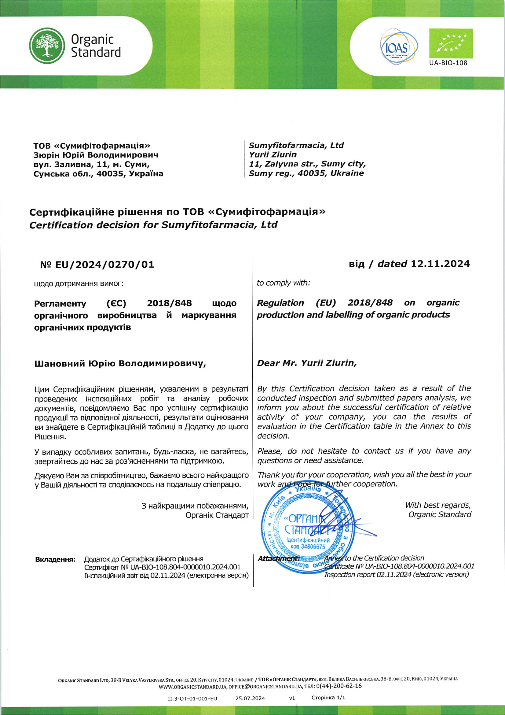 Компанія ТОВ «Сумифітофармація» сертифікована за стандартами Системи менеджменту якості (ISO 9001:2015) та Системи безпеки продуктів харчування (ISO 22000:2018), а також Системи виробництва органічної (БІО) продукції.